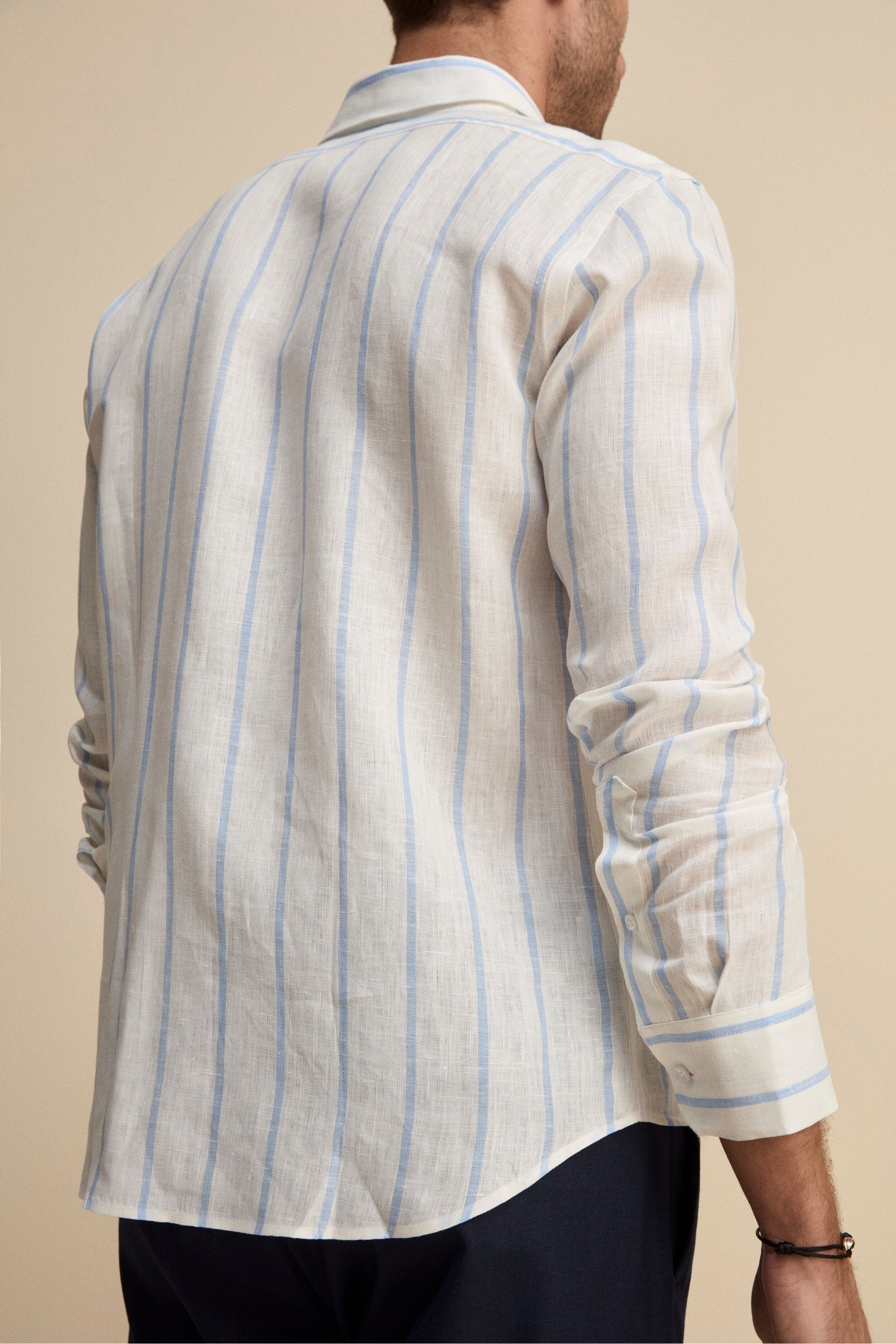 French Collar Linen Shirt with Pocket - White and Light Blue Striped
