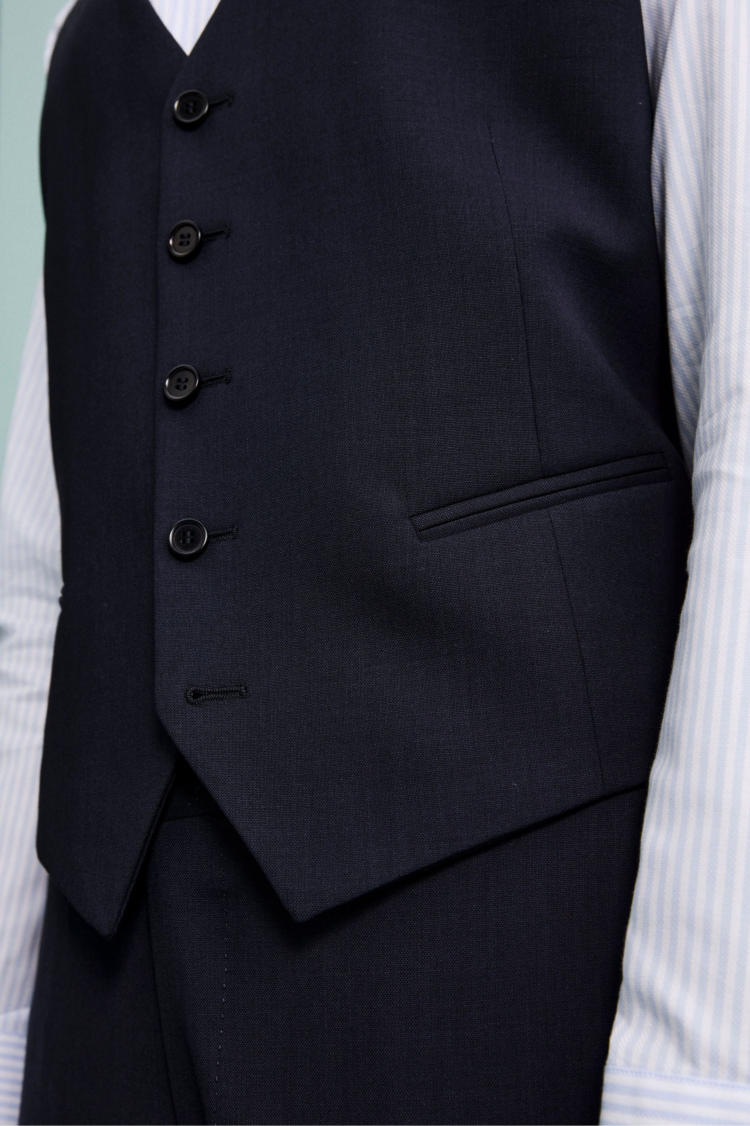 Elegant men’s waistcoat crafted from 100% virgin wool with Cerruti 1881 ITravel fabric, designed for comfort, breathability, and crease resistance. The front button closure with covered buttons and welt front pockets add a refined and tailored touch. The adjustable back strap ensures a flawless fit, while the regular fit guarantees the perfect balance between comfort and structure. Ideal for ceremonies and special occasions, this waistcoat pairs perfectly with matching jacket and trousers for a polished and personalized look. Entirely Made in Italy. The model is 189 cm tall and wears size 50.